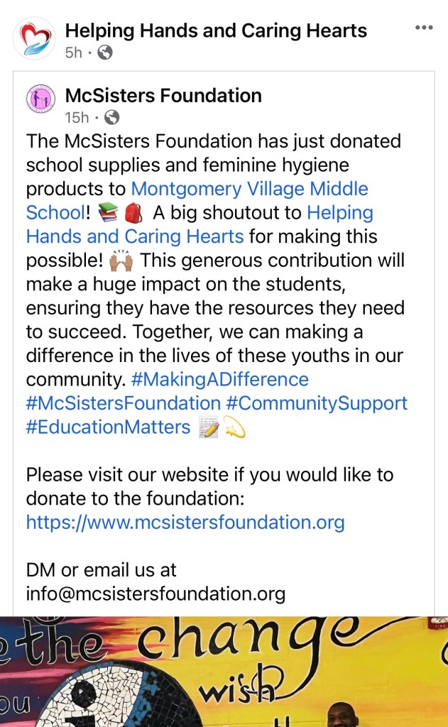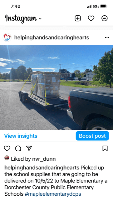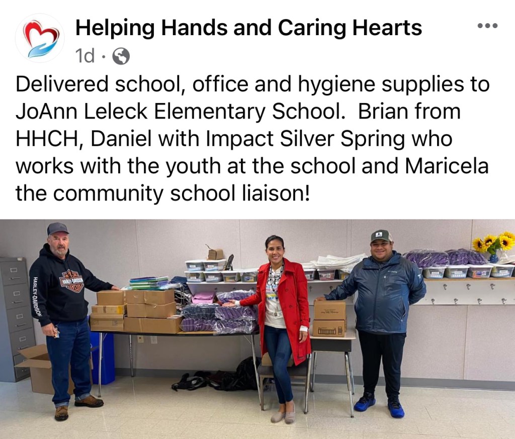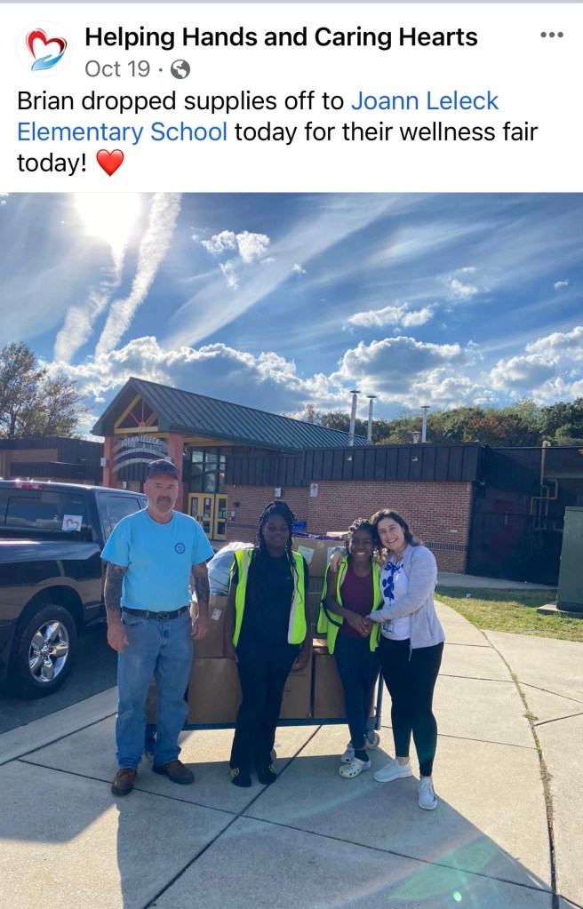 Helping Hands and Caring Hearts worked on collecting school supplies for a worthy school district in the DMV area and we chose Maple Elementary a Dorchester County School District School. We are delivering the supplies in the photos on Wednesday 10/5/2022
