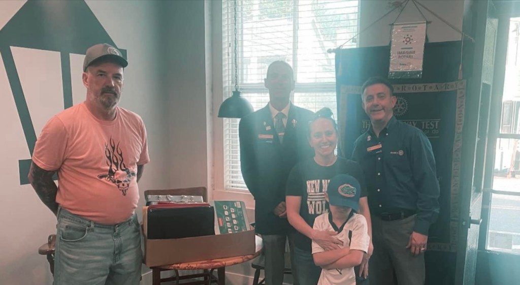 Brian from HHCH delivered some supplies to Claire for the New Market Walking and Wheeling Wolves, with Will and Scott from the Rotary Club of New Market. (sunlight coming through window on Will).
