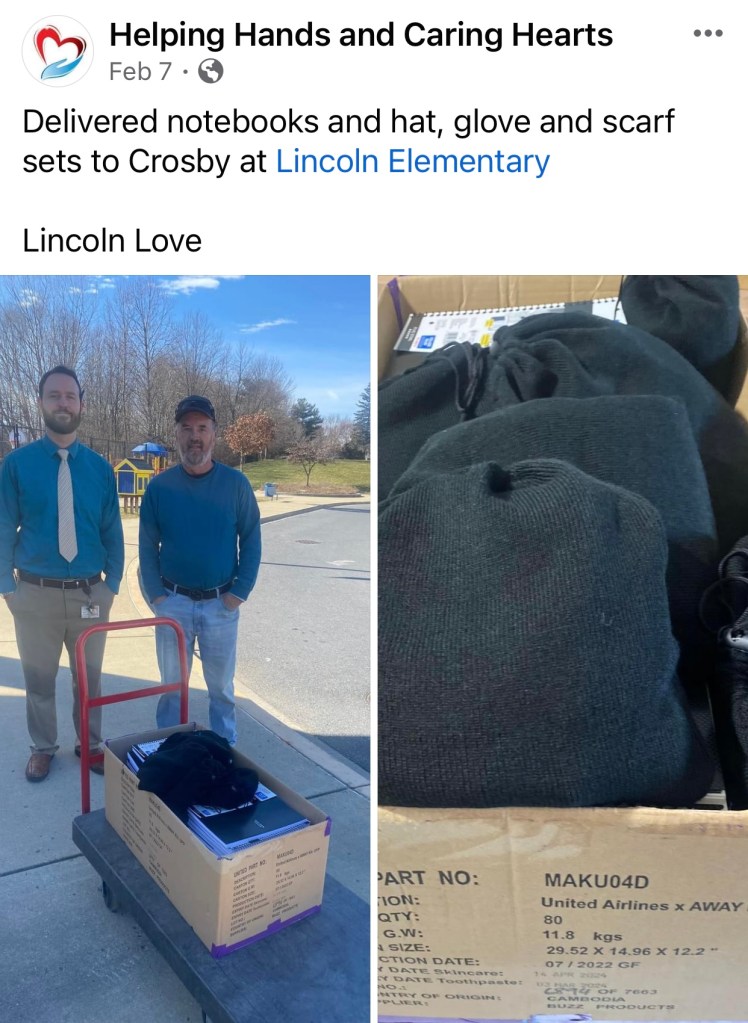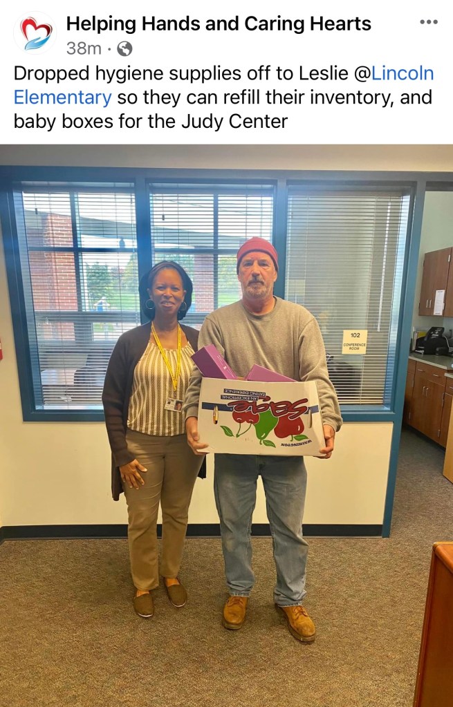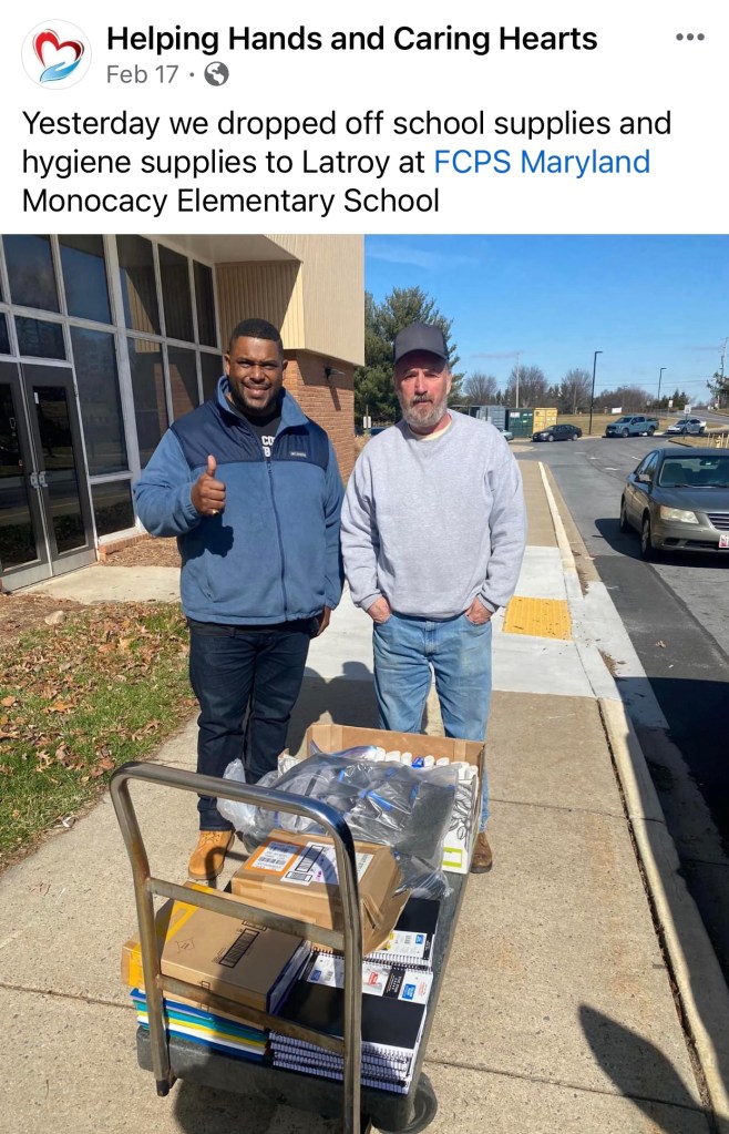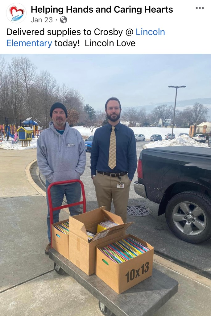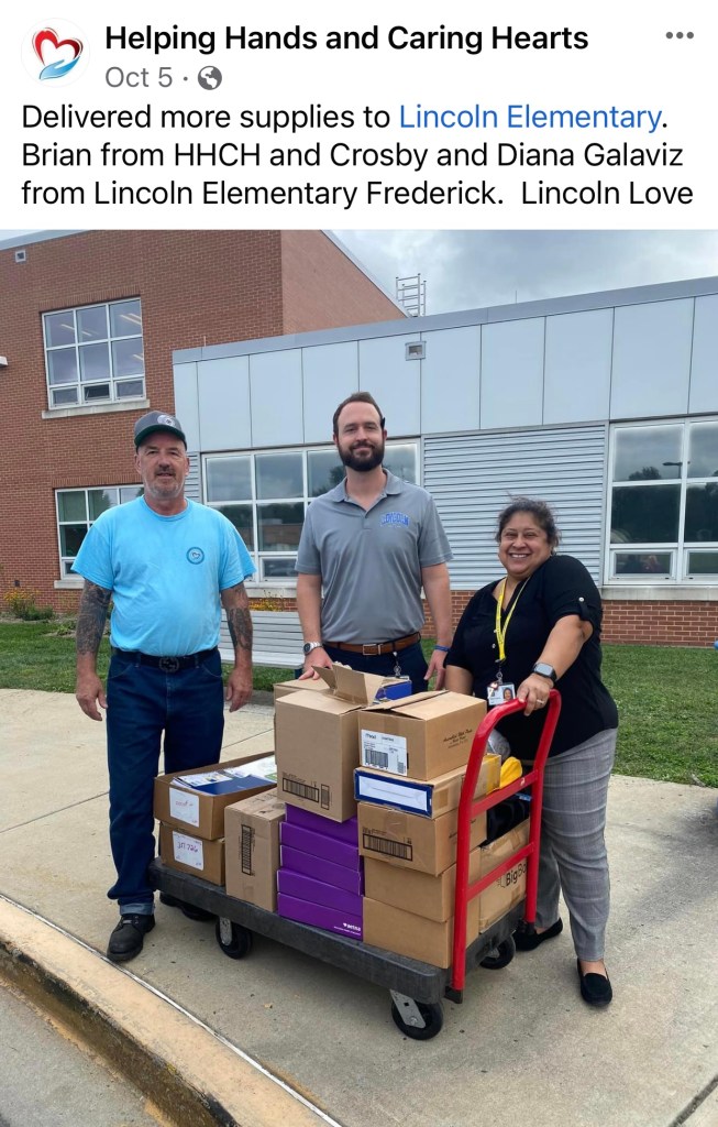 Delivered school, art, hygiene and office supplies to Lincoln Elementary School in Frederick today! Brian from HHCH and Crosby from Lincoln Elementary.